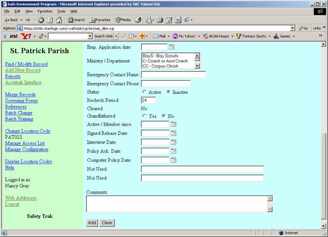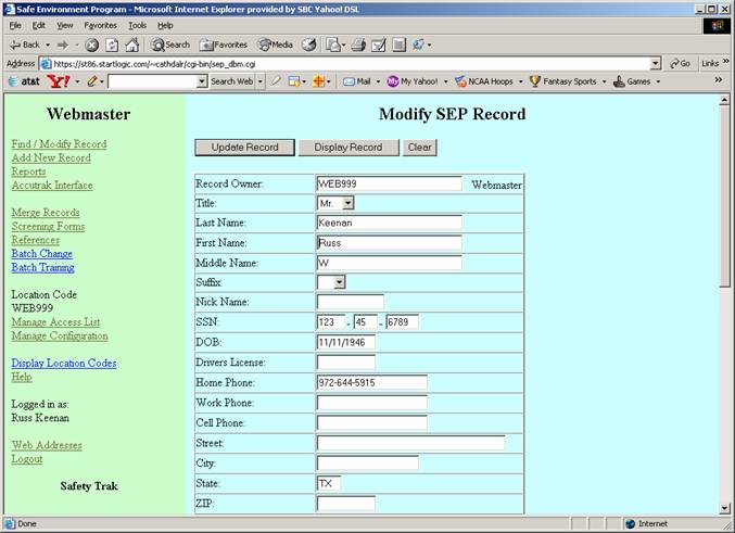 To add a new employee or volunteer, the Safety Officer selects the “Add New Record” link from the left frame. The result is shown in the following screen shots.  The SSN field will accept the following: