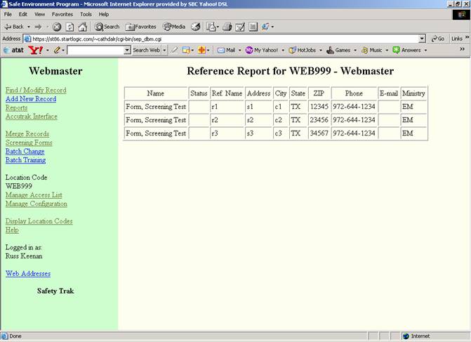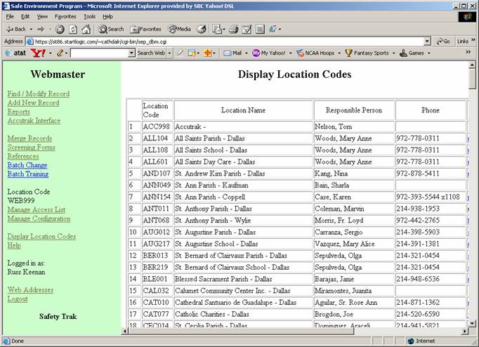 The SEP database system allows a Safety Officer to keep track of the people who are working with children and vulnerable adults.  Since this is a Web based application, the Safety Officer can access the functionality from anywhere and anytime.  Some of this data is sensitive, so the application interface is via a secure Internet connection, and the Social Security Number (SSN) is encrypted.