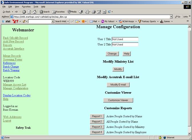 This function allows the owner of a location code to give titles to the user fields, add entries to the ministry list, manage E-mail